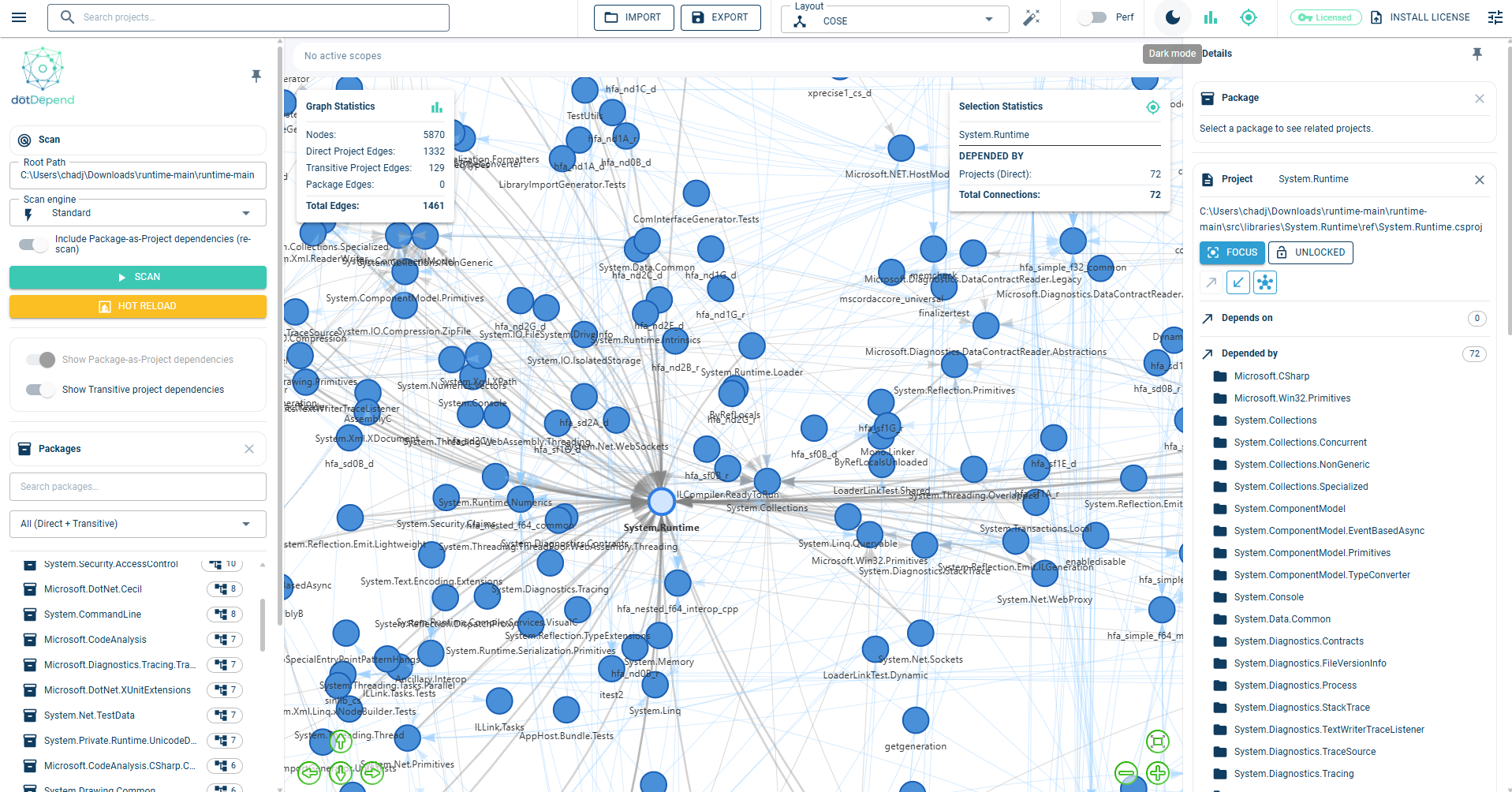 Zoom, pan, drag, focus and lock nodes. Highlight project-to-project dependencies and package usage. Make invisible complexity visible.